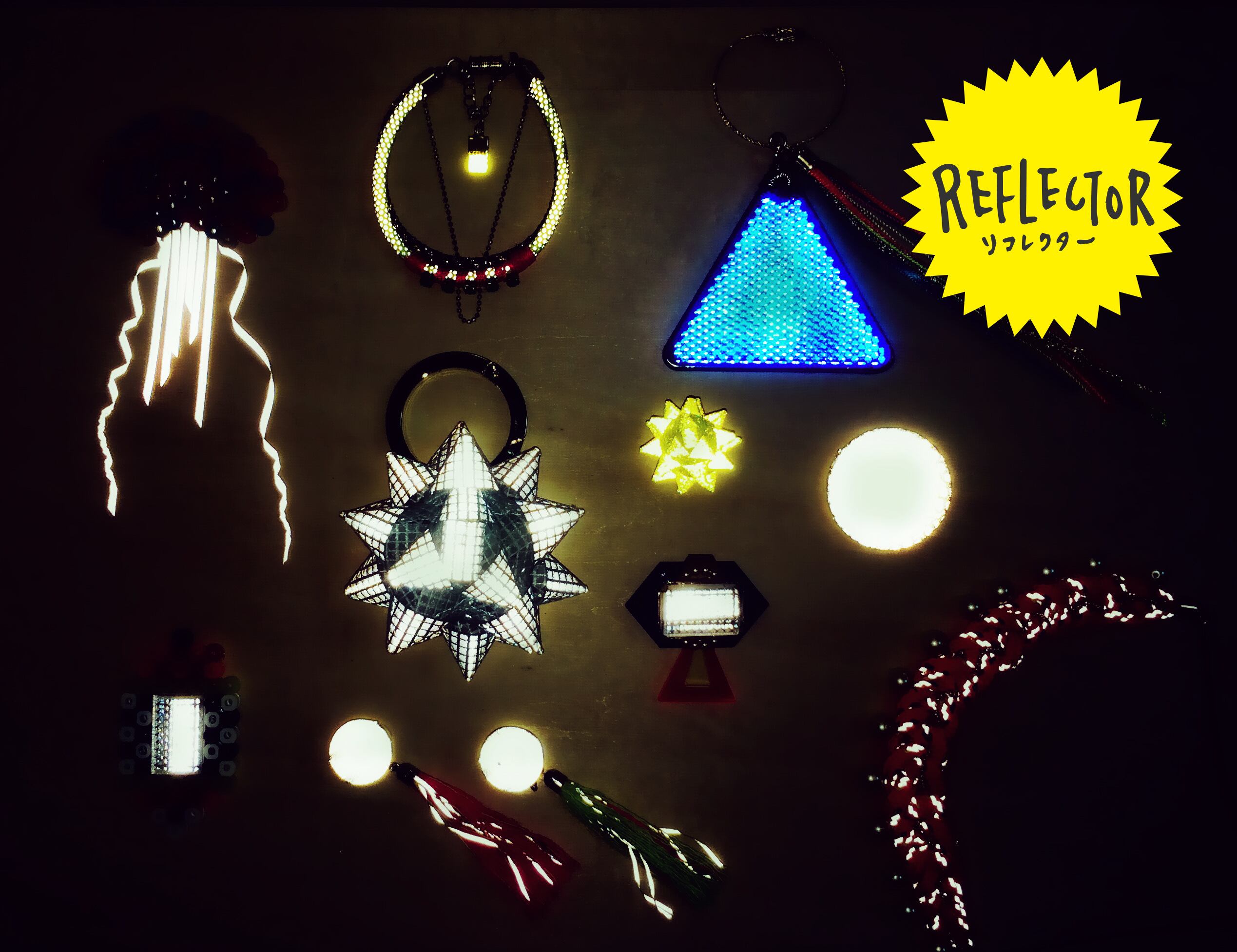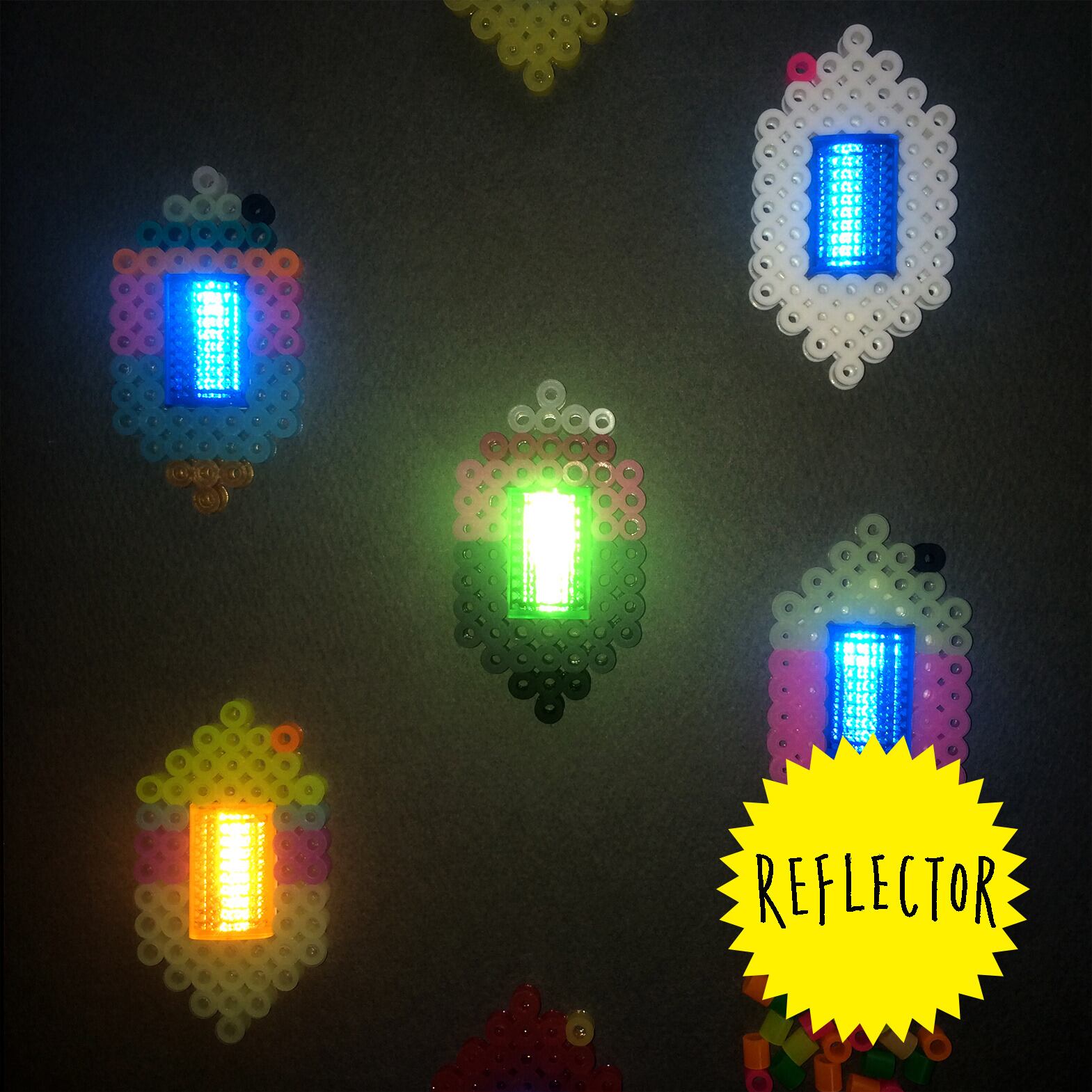 素材:反射板(アクリル樹脂)、アイロンビーズ(ポリエチレン),アクリル,スポンジ,金具(真鍮)
